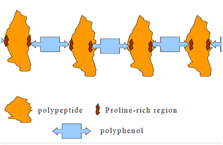 Ο μηχανισμός που ενώνονται οι πολυφαινόλες με τις πρωτεϊνες είναι ένα πεδίο έρευνας για τους επιστήμονες και έχουν αναπτυχθεί αρκετά μοντέλα. Στο παρόν άρθρο θα εξετάσουμε μερικά από αυτά. Ένα μοντέλο είναι αυτό που ανέπτυξαν οι Siebert & Lynn κατά το οποίο οι πολυφαινόλες έχουν δύο ενεργά άκρα τα οποία μπορούν να συνδεθούν με το μέρος του πολυπεπτιδίου της πρωτεΐνης που είναι πλούσιο στο αμινοξύ προλίνη όπως παρουσιάζεται και σχηματικά στην εικόνα 4. Αξίζει να σημειωθεί εδώ ότι η προλίνη είναι το μοναδικό αμινοξύ στο γλεύκος το οποίο η μαγιά δεν μπορεί να το καταναλώσει διότι δεν έχει διαπερατότητα για να επιτρέψει την μεταφορά στο κύτταρο.