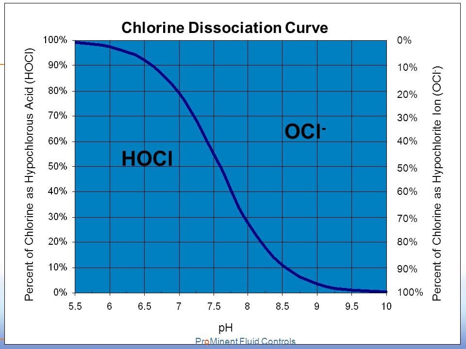 Η διαφορά είναι ότι το υποχλωριώδες οξύ είναι περίπου 80 φορές πιο δραστικό από το υποχλωριώδες ανιόν. Από ποιά μορφή επικρατεί αυτό εξαρτάται από το pH του νερού, όσο πιο όξινο είναι το pH τόσο πιο πολύ επικρατεί το υποχλωριώδες οξύ που είναι πιο δραστικό. Σε τιμές pH άνω του 7.5 επικρατεί η ιοντική μορφή που είναι λιγότερη δραστική. θα πρέπει επομένως να λαμβάνεται υπόψη από τους υπεύθυνους. Στις παρακάτω φωτογραφίες φαίνεται η συσχέτιση HOCl και OCl⁻ σε συνάρτηση με το pH του νερού